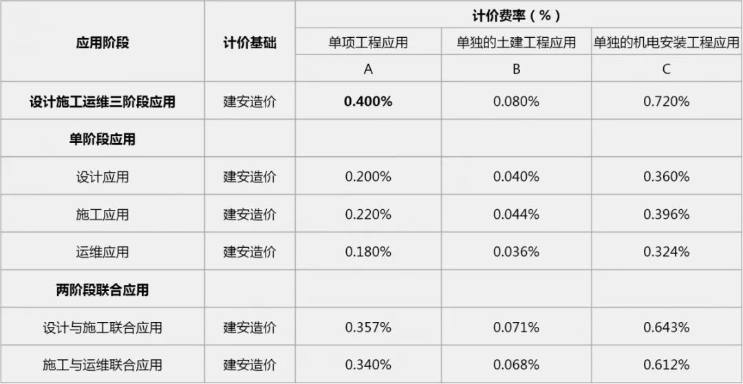 BIM技术应用费用=基价×(A应用阶段调整系数)× (B工程复杂程度调整系数) ×(C造价咨询调整系数),费用基价费用基价是基于全阶段、全专业应用的标准。