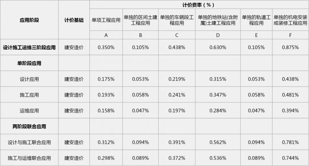 新建项目新建民用建筑工程项目的BIM应用,分设计阶段、施工阶段、运维阶段等阶段,根据不同应用等级,完成一次建模和基本应用的费用计价标准详见表6。