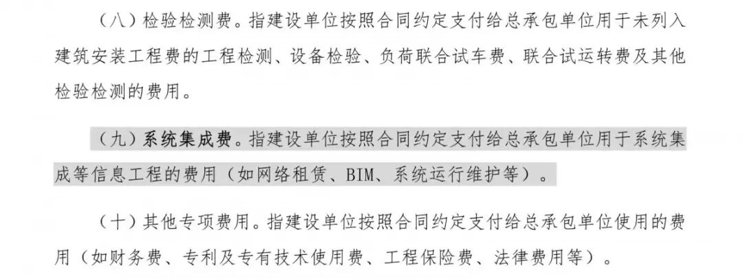 系统集成费:指建设单位按照合同约定支付给总承包单位用于系统集成等信息工程的费用(如网络租赁、BIM、系统运行维护等)。