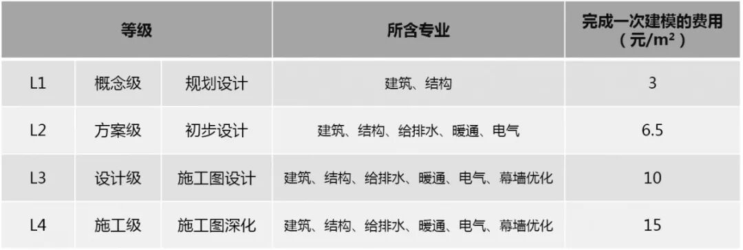 BIM 建模收费根据模型深度可分为 L1~L4 四个等级,分别为概念级、方案级、设计级、施工级。各等级深度要求及完成一次建模的收费标准如下: