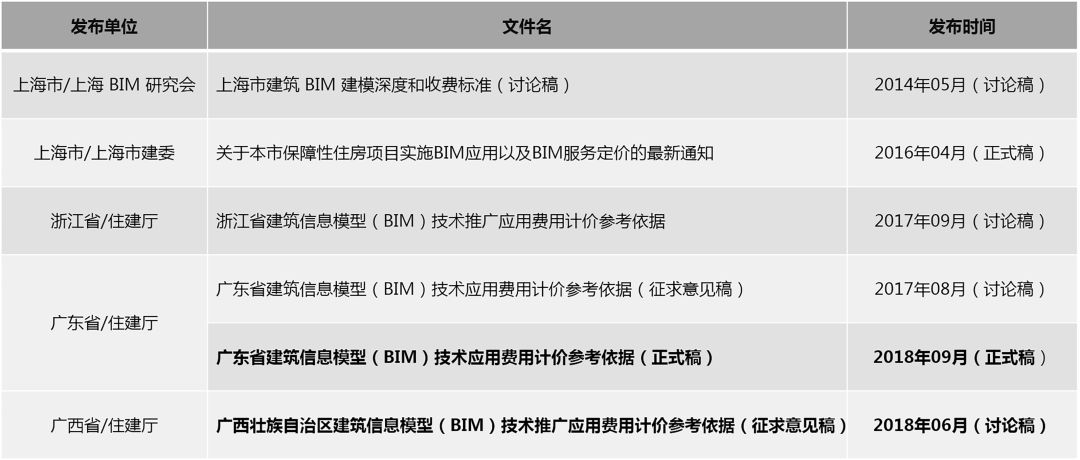 截至2018年9月,国内共有四个省市(按时间顺序依次为上海、浙江、广东、广西)由相关部门正式发布了关于BIM收费的相关政策,用于指导地方的BIM收费标准。